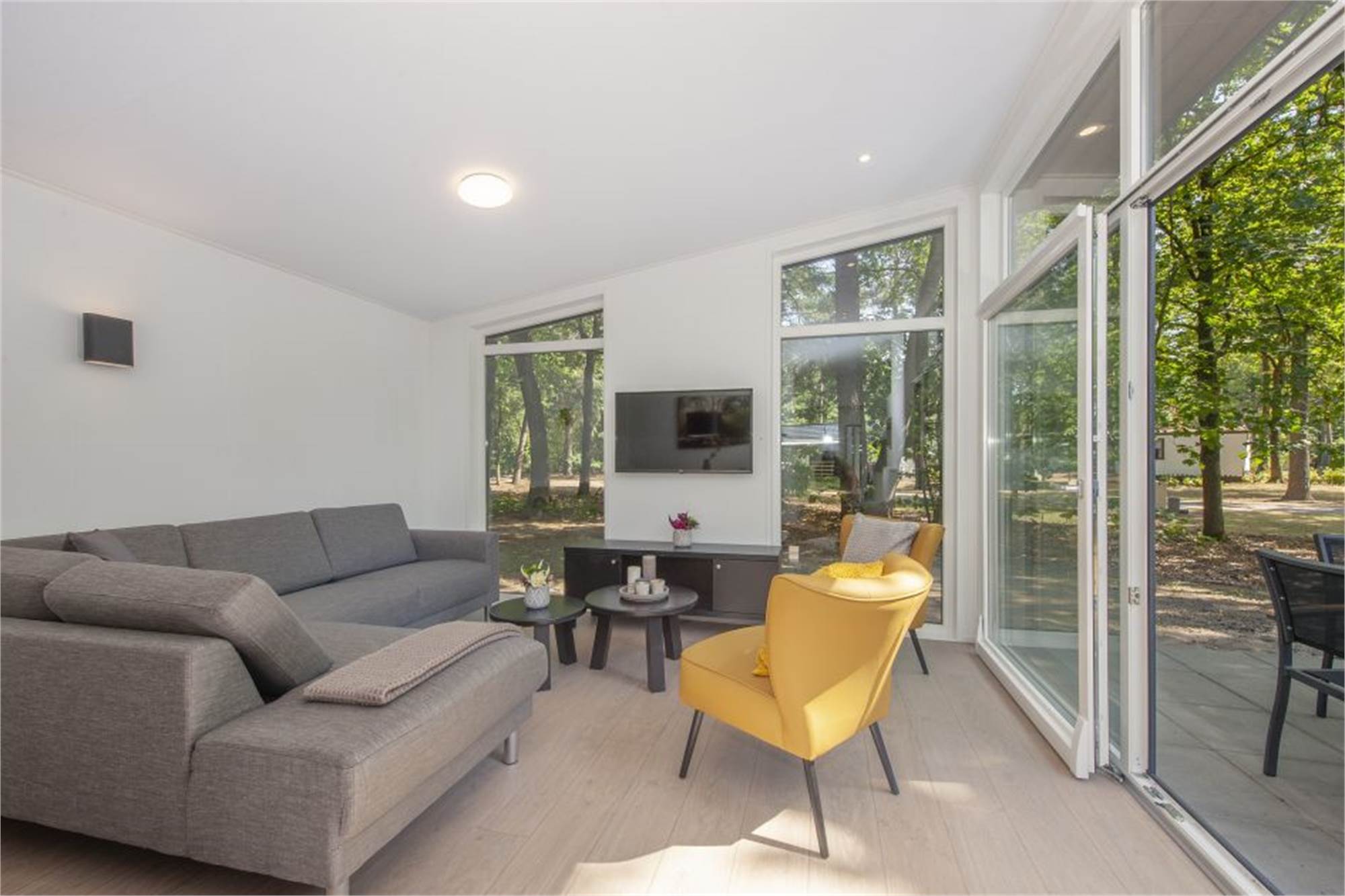This is a brand new lodge type! A new lodge will of course include a new garden. The garden is not yet fully grown. If you would still like lounging on the lawn, or playing among the trees, there is plenty of space at the swimming pond!