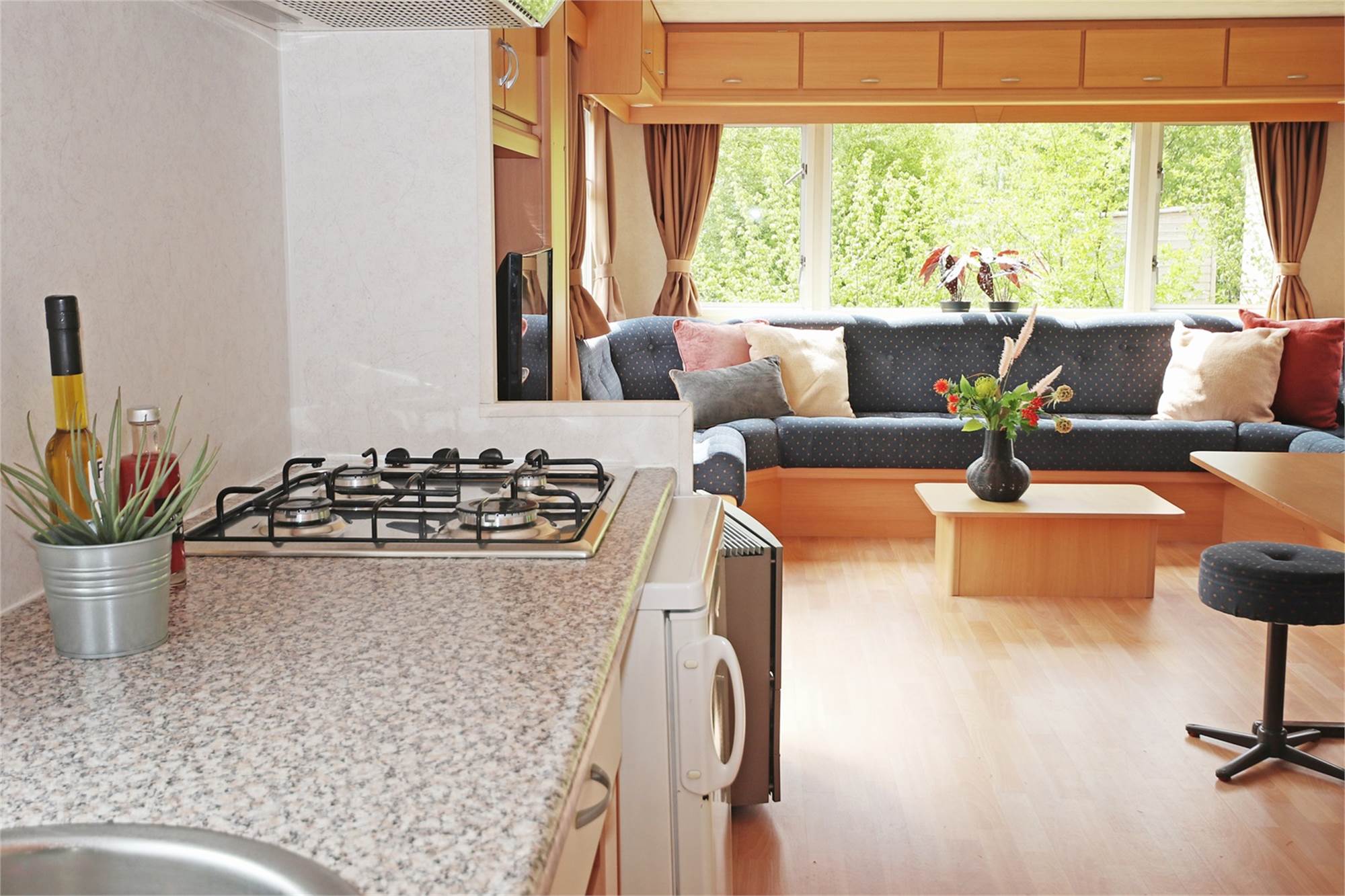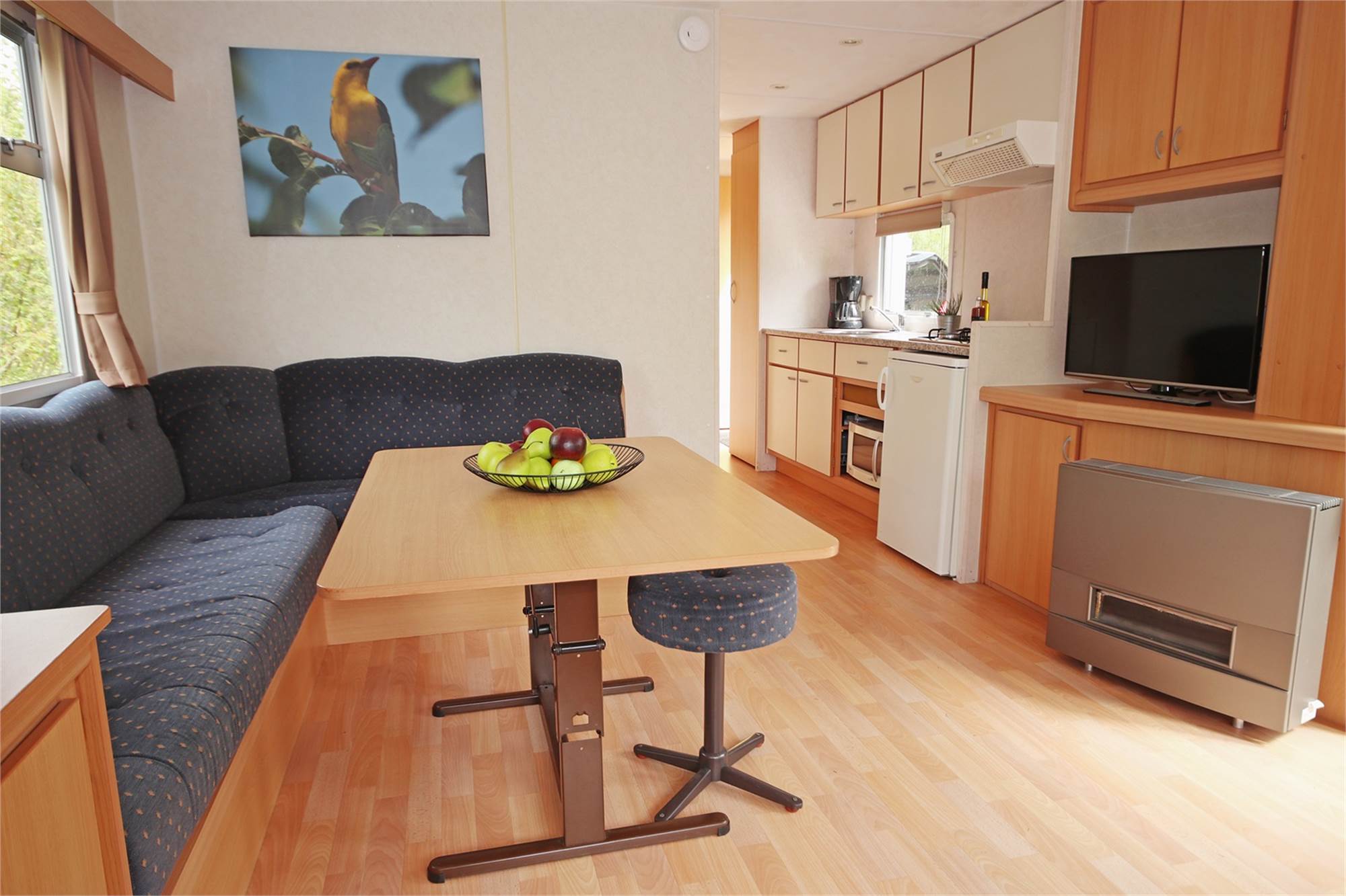 General/location Design Characteristics Vacuum cleaner Double terrace doors Eethoek annex slaapplaats voor max. 2 personen Gas heater Outside garden Terrace furniture Parking near the accommodation Small shed/ storeroom Audio/Video/Electronics Television Internet WIFI at the park Kitchen Basic open kitchen Coffee maker Electric kettle Cooker hood Fridge + freezing compartment Gas stove with 4 cooking rings Microwave Sleeping Eiderdowns Number of bedrooms: 2 Sanitary Seperate toilet Shower cabin Bathroom at the ground floor Washbasin in bathroom