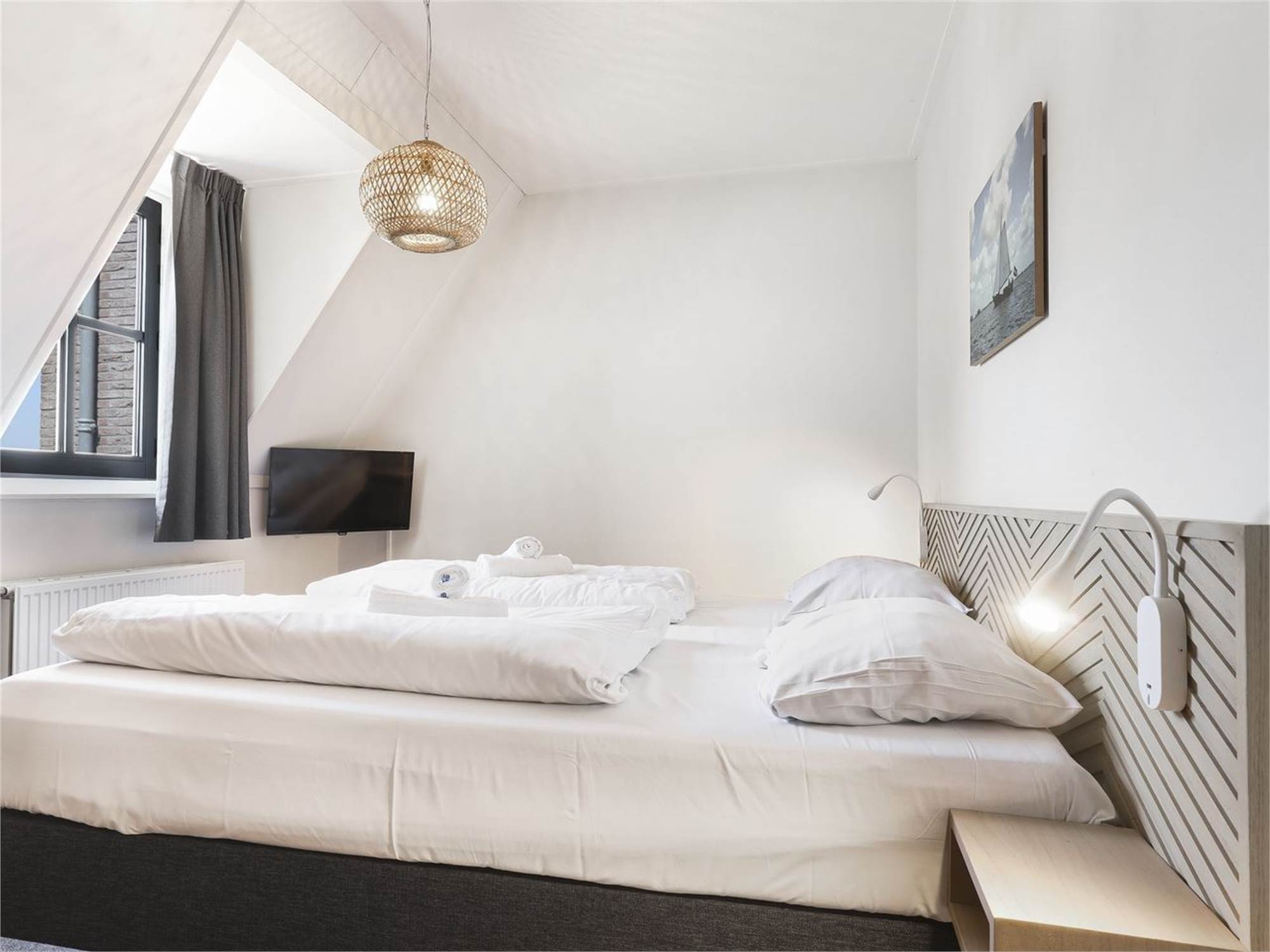 Bedroom with two single box spring beds and flatscreen TV on the first floor