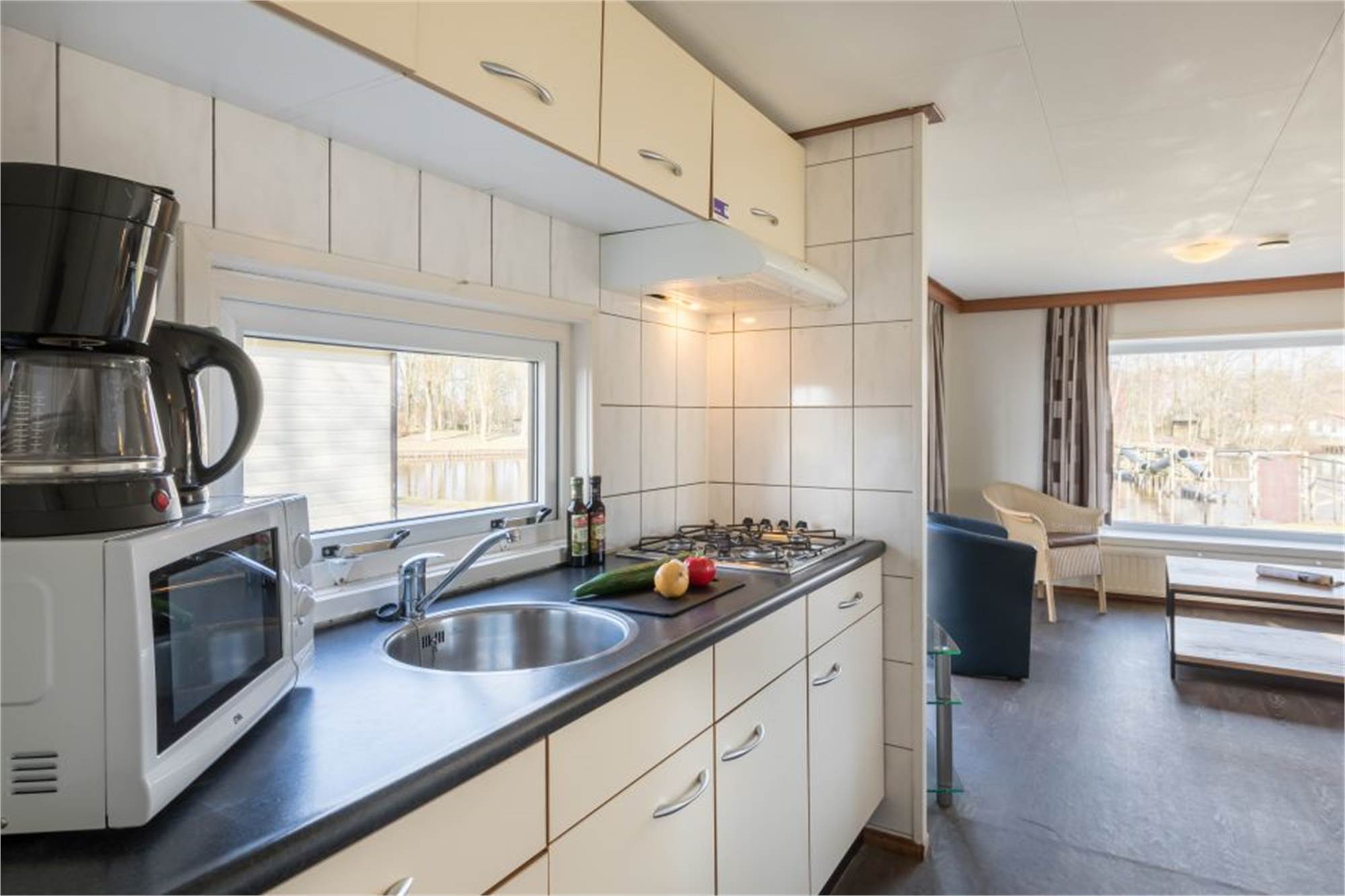 This detached chalet is one-level and suitable for 5 persons. The chalet has a living room with television and an open kitchen with microwave, fridge and coffee machine. There are 2 bedrooms, 1 of which with 2 single beds and 1 with a bunkbed and 1 single bed. The chalet has a bathroom with shower and toilet, and is in addition provided with a furnished terrace. A car park is near the accommodation and use of Wi-Fi is free of charge.