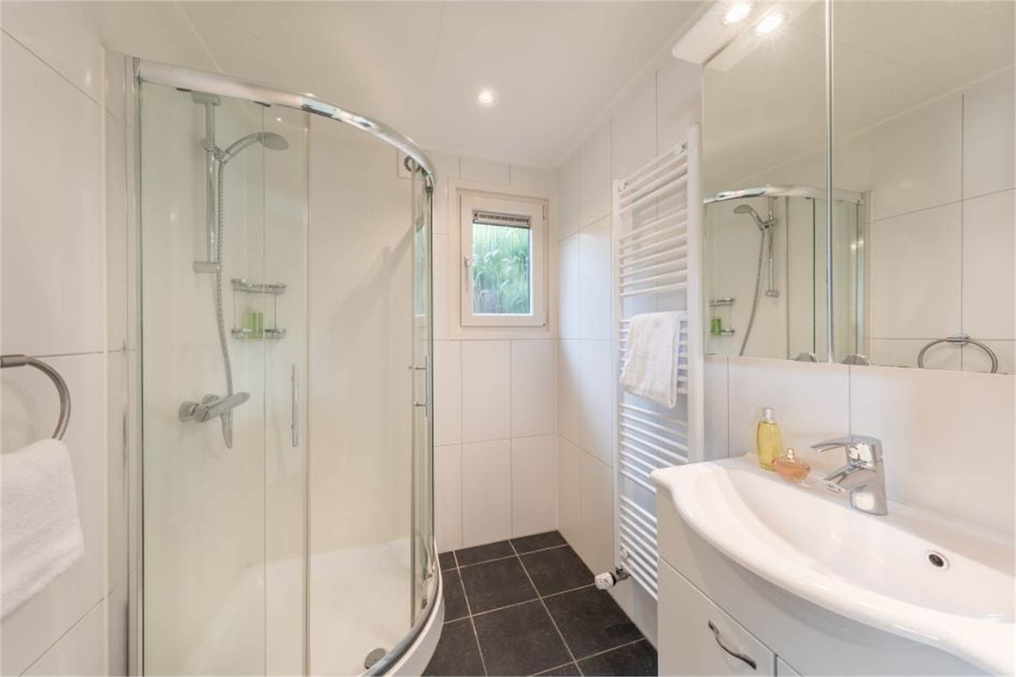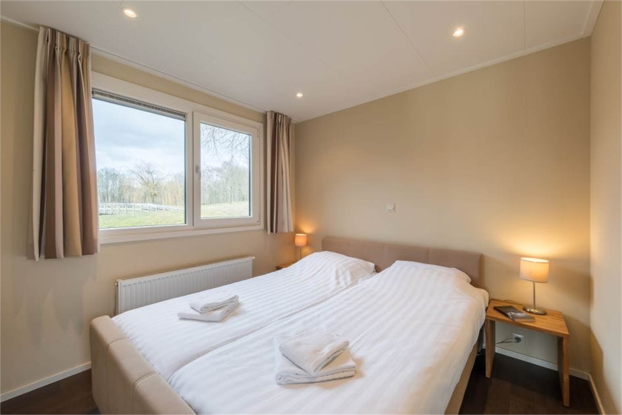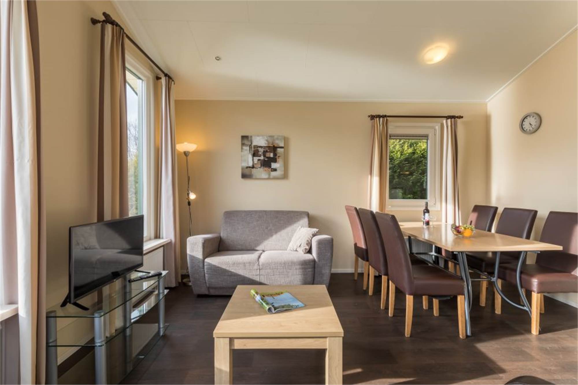This detached chalet is one-level and suitable for 6 persons. The chalet has a living room and an open kitchen with microwave oven, fridge/freezer, dishwasher and coffee machine. There are 3 bedrooms, 1 of which with 2 single box spring beds and 2 with a bunkbed. The chalet has a bathroom with shower and toilet, and is in addition provided with a furnished terrace. Use of Wi-Fi is free of charge.